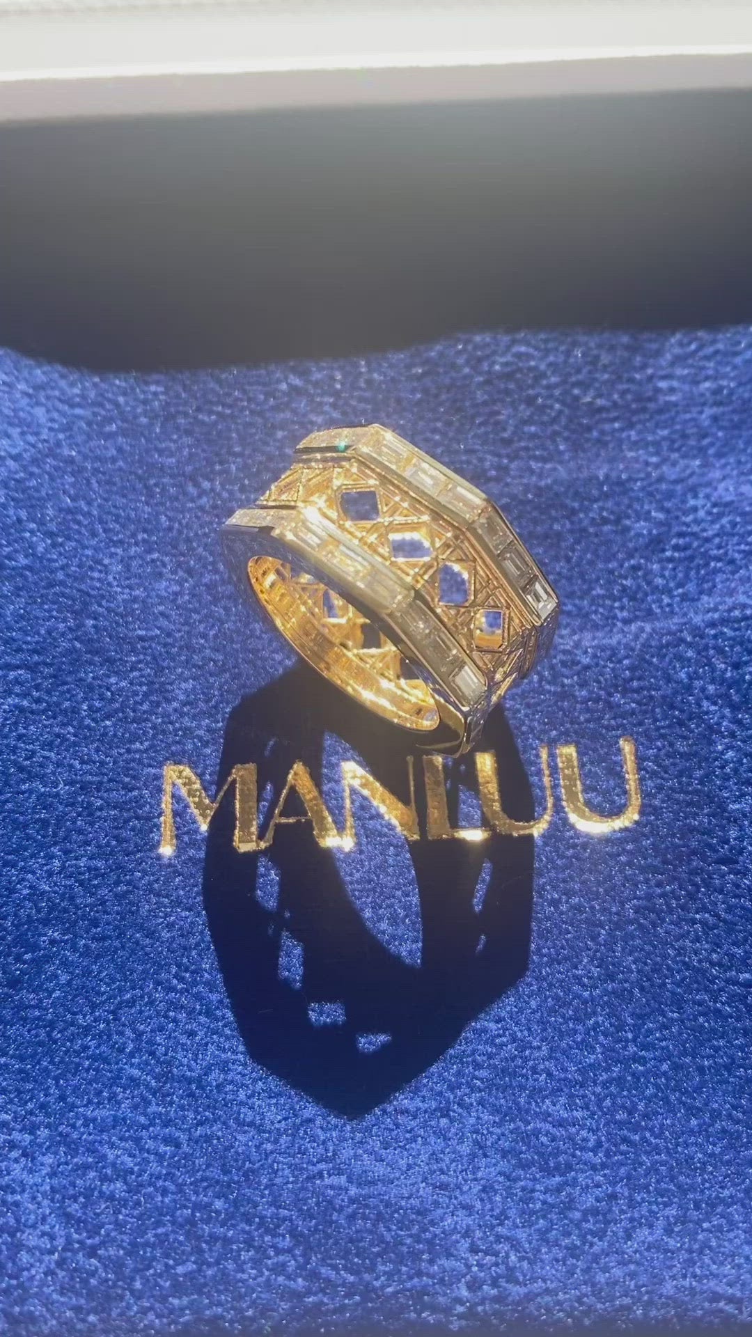 Instantly recognizable with its MoAnA Luu Cane pattern, the Doudou wide ring is cast from 18 kt yellow gold, enriched with baguette diamonds